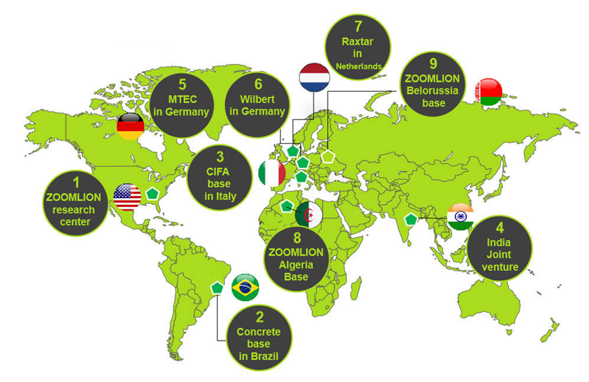 Zoomlion objął swoim zasięgiem ponad 100 krajów i regionów na całym świecie i dokonał już ustaleń rynkowych w celu podążania za inicjatywą Pasa i Szlaku. Produkty Zoomlion zostały dobrze sprzedane na rynkach Bliskiego Wschodu, Ameryki Południowej, Afryki, Azji Południowo-Wschodniej, Rosji, a także na wielu rynkach high-end w USA, Europie i Australii. Firma posiada spółki zależne w prawie 20 krajach w Azji Wschodniej, Azji Południowo-Wschodniej i Europie itd., a także parki przemysłowe i technologiczne we Włoszech, Niemczech, Indiach, Brazylii i na Białorusi, a także ponad 50 biur rezydentów na całym świecie. Sieć logistyczna i system dostaw części o światowym zasięgu, skoncentrowane w Zjednoczonych Emiratach Arabskich i Brazylii, są stopniowo tworzone.